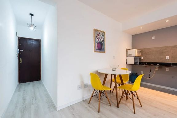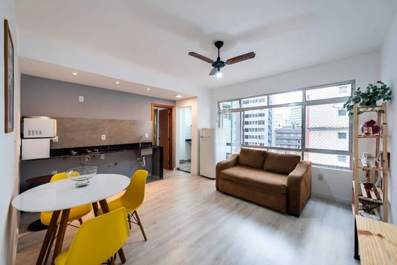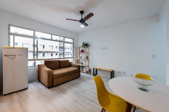 Totalmente reformado, o apartamento passou por atualização completa de elétrica, hidráulica, pisos, revestimentos e pedras, com projeto assinado por engenheiro, garantindo segurança, funcionalidade e excelente acabamento. A planta é bem distribuída, contando com 1 quarto confortável, sala aconchegante, cozinha funcional, área de serviço e banheiro social.