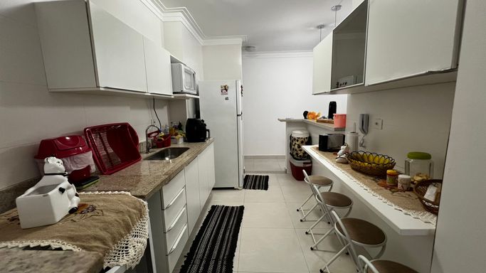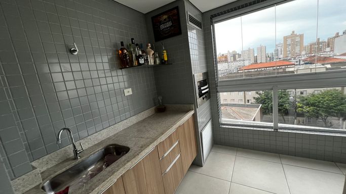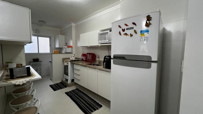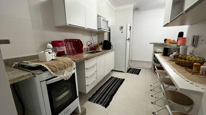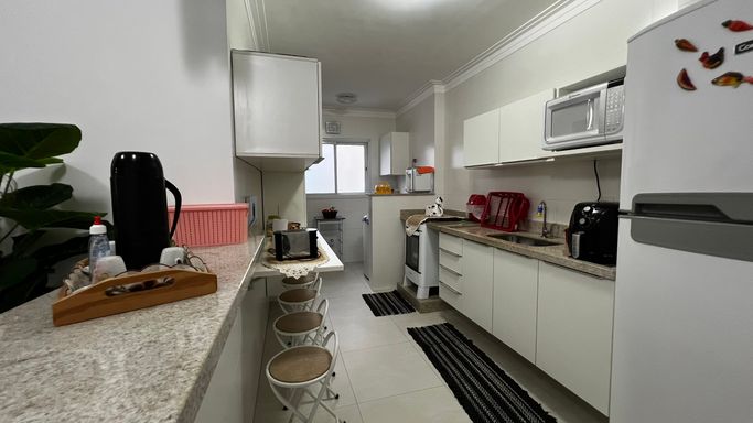 Distribuído em 2 dormitórios, sendo 1 suíte, o apartamento conta com uma sala ampla integrada à sacada gourmet, ideal para reunir a família e amigos em momentos especiais. A cozinha moderna e funcional se conecta à área de serviço independente, otimizando o espaço e garantindo mais organização. O imóvel ainda oferece banheiro social e 2 vagas de garagem, um diferencial importante na região.
