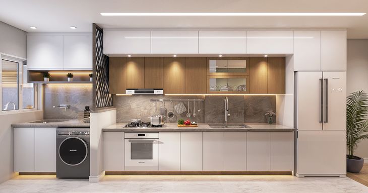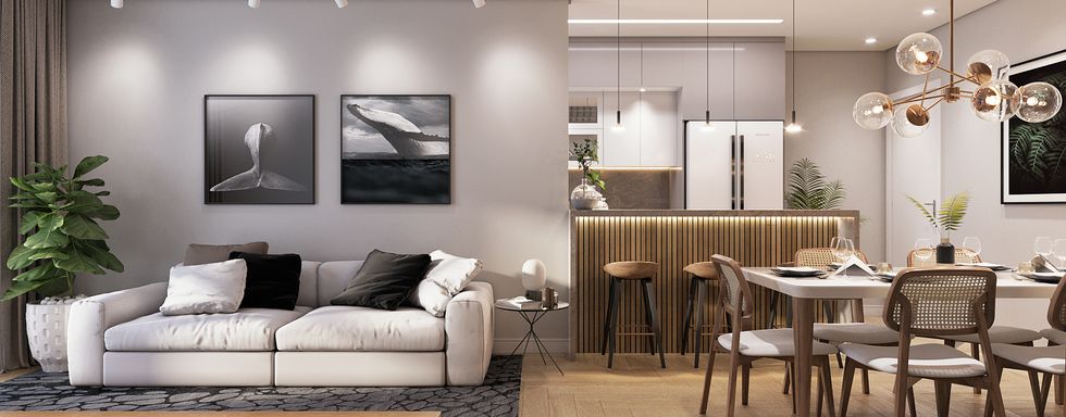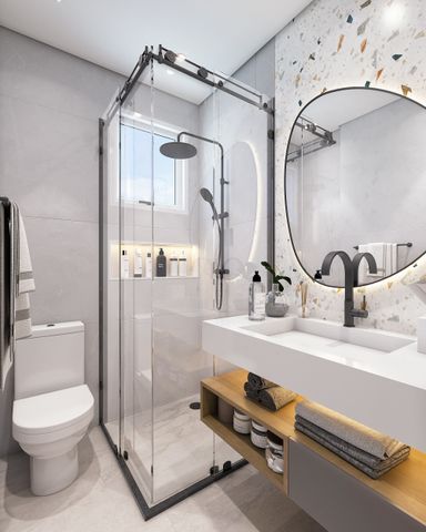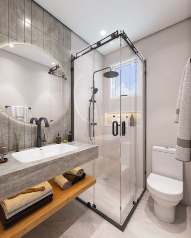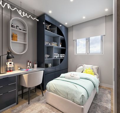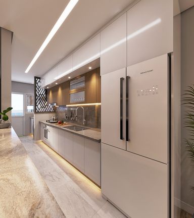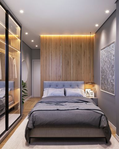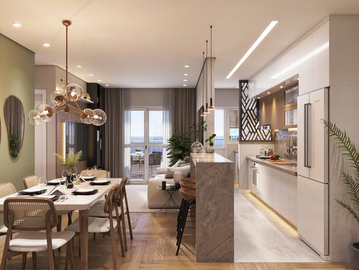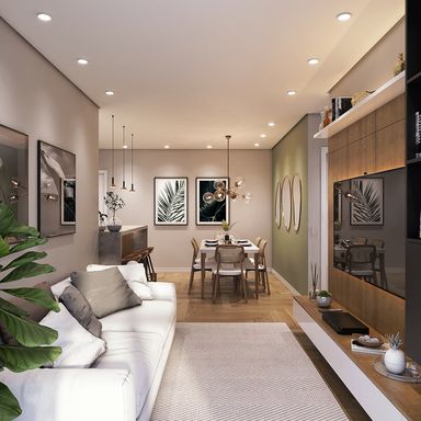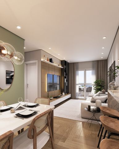 Apartamento com 2 quartos, sendo 1 suíte, sala de estar, cozinha, área de serviço, banheiro social e 1 vaga de garagem.