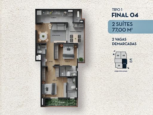 Apartamento novo à venda no Canto do Forte, em Praia Grande, com 77,08 m² de área útil, projetado para oferecer conforto, funcionalidade e excelente padrão construtivo em uma das localizações mais valorizadas da cidade. O imóvel conta com dois dormitórios, ambos suítes, sala de estar integrada, cozinha prática, área de serviço, terraço técnico para ar-condicionado, varanda gourmet ideal para momentos de lazer, além de lavabo e duas vagas de garagem, garantindo comodidade e praticidade no dia a dia. A planta é moderna, bem distribuída e pensada para quem busca qualidade de vida, seja para moradia ou investimento.