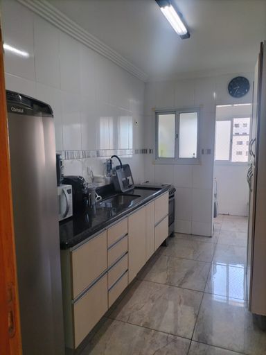 A cozinha integrada à área de serviço é funcional e bem planejada, acompanhando a proposta de um ambiente moderno e otimizado. O imóvel conta ainda com 2 vagas de garagem, garantindo comodidade e segurança.