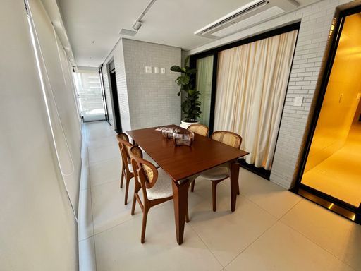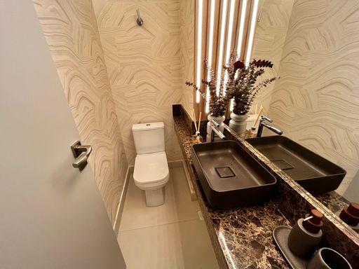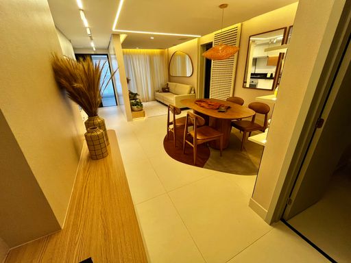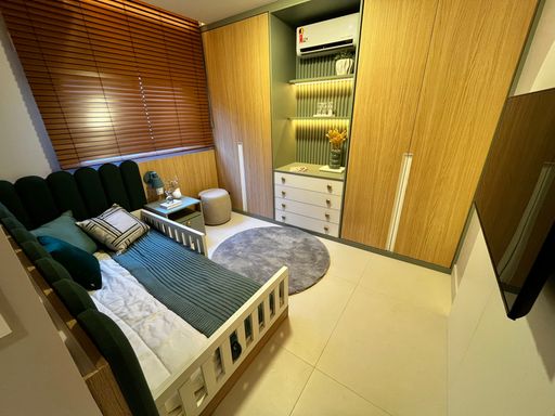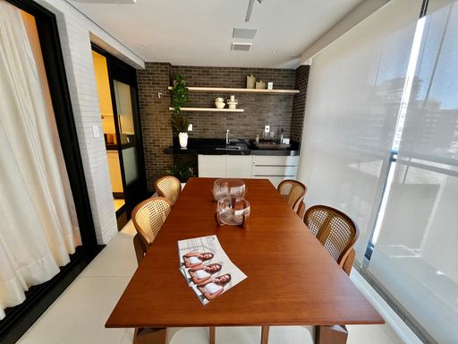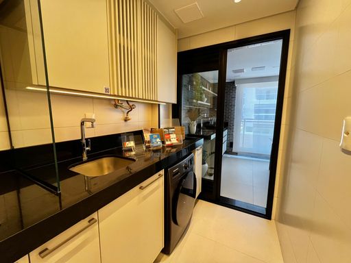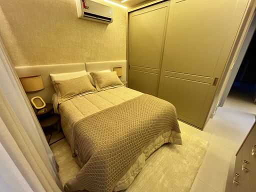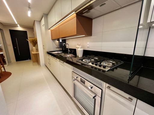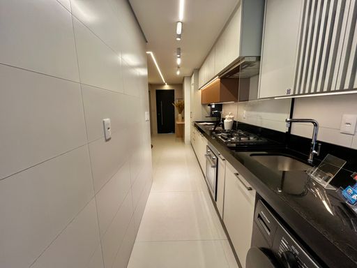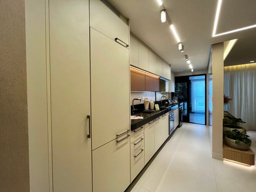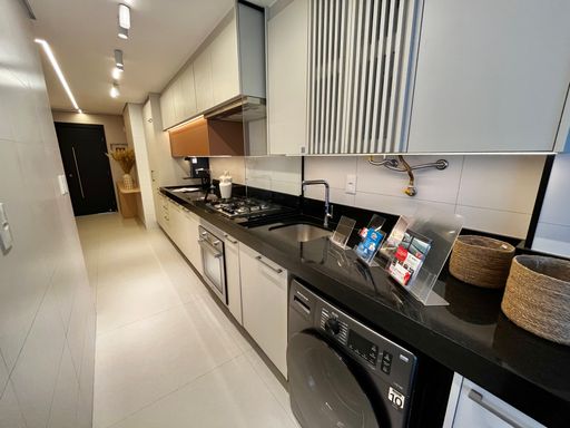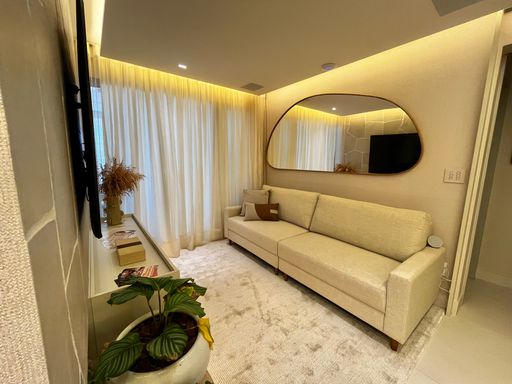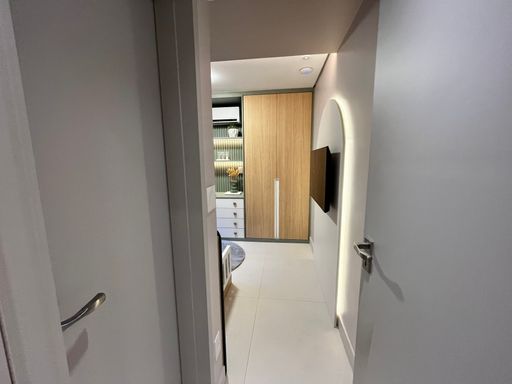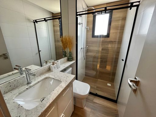 O apartamento conta com 2 dormitórios, ambos suítes, além de lavabo, piso em porcelanato, persianas blackout, infraestrutura completa para ar-condicionado, janelas de alumínio com acionamento por controle remoto e 1 vaga de garagem privativa. Todos os detalhes foram pensados para proporcionar conforto térmico, acústico e visual, com pontos de água quente a gás nos chuveiros, torneiras dos banheiros e da cozinha.