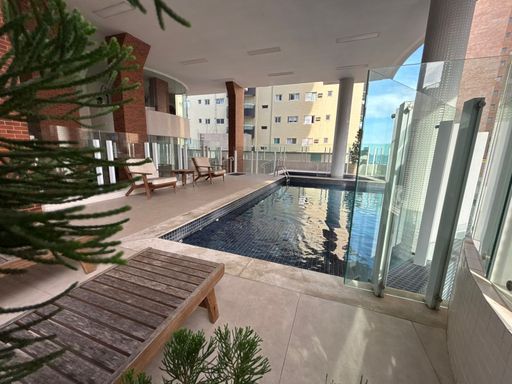 Destaque para a varanda gourmet que envolve todos os cômodos do imóvel, já com fechamento de vidro, frente para a rua e com vista parcial para o mar – perfeita para quem deseja apreciar a brisa litorânea com privacidade e conforto.