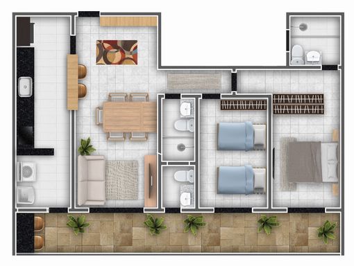 São 2 dormitórios, sendo 1 suíte, ambientes bem planejados e uma ampla sala integrada à sacada — perfeita para relaxar apreciando a vista e sentir a brisa do mar. A cozinha é funcional, com ótimo espaço e ventilação, ideal para o dia a dia.