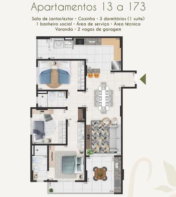 Com 104 m² de área útil muito bem distribuídos, este imóvel foi projetado para oferecer conforto, funcionalidade e qualidade de vida para toda a família. Possui 3 dormitórios, sendo 1 suíte, sala de estar e jantar integradas, cozinha ampla, banheiro social, área de serviço, área técnica, varanda ampla e 2 vagas de garagem, tudo pensado para proporcionar praticidade e bem-estar em cada ambiente.
