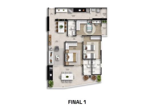 Apartamento com 115 m² de área útil e 188m² de área total, composto por 3 quartos, sendo 2 suítes, sala de estar e jantar, cozinha americana, área de serviço, banheiro social e 2 ou 3 vagas de garagem.