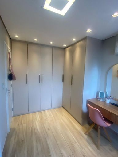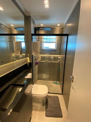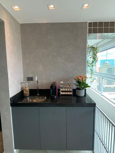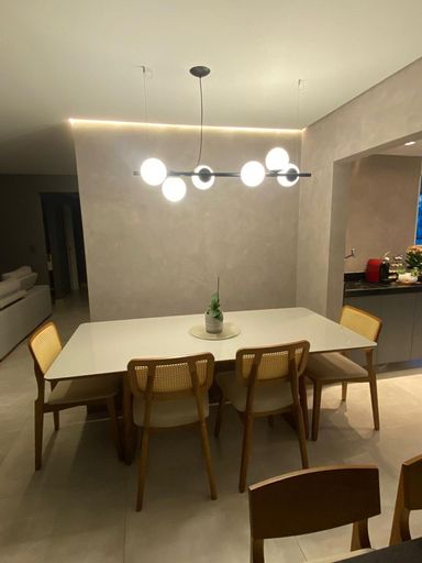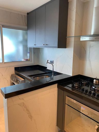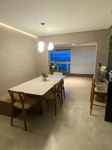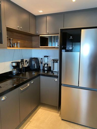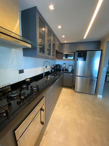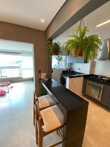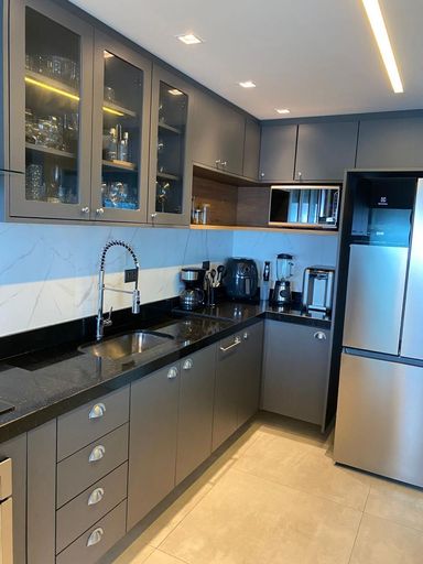 A cozinha americana traz modernidade e praticidade ao dia a dia, além de contar com área de serviço independente e lavabo. O apartamento dispõe ainda de 02 vagas de garagem.