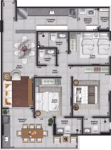 Detalhes do apartamento de 105m2 de área útil .