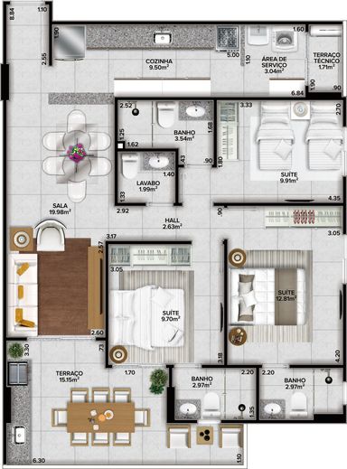 Detalhes do apartamento de 105m2 de área útil .