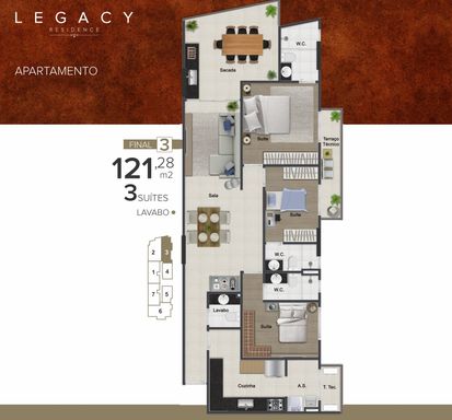 O apartamento é composto por 3 dormitórios, sendo 3 suítes, banheiro social, lavabo, ampla sala de estar e jantar, cozinha espaçosa, área de serviço e 3 vagas de garagem. Todos os ambientes foram planejados para oferecer amplitude, funcionalidade e sofisticação. O projeto arquitetônico inovador deste empreendimento valoriza a vegetação nativa litorânea, trazendo leveza e identidade visual única à fachada e às áreas comuns.