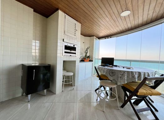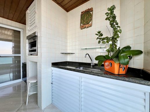 O apartamento possui 3 dormitórios, sendo 2 suítes, sala ampla para até 3 ambientes, varanda gourmet com vista total e permanente do mar, cozinha isolada e planejada, lavanderia com banheiro, banheiro social e 2 vagas de garagem demarcadas.