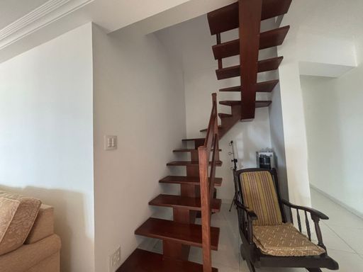 Com 310,77 m² de área útil, o imóvel foi pensado para quem valoriza amplitude e funcionalidade. São dois andares muito bem distribuídos, conectados por uma escada em madeira com corrimão, que traz elegância e aconchego ao ambiente. A cobertura conta com cinco dormitórios, sendo quatro suítes, todos mobiliados, além de duas salas amplas, um lavabo, home office reservado e uma lavanderia sob medida, garantindo praticidade no dia a dia.