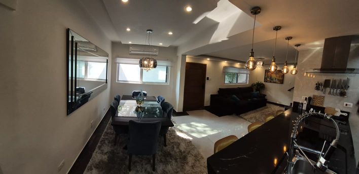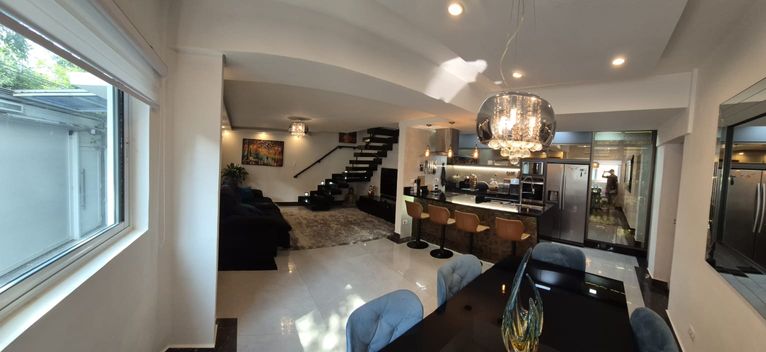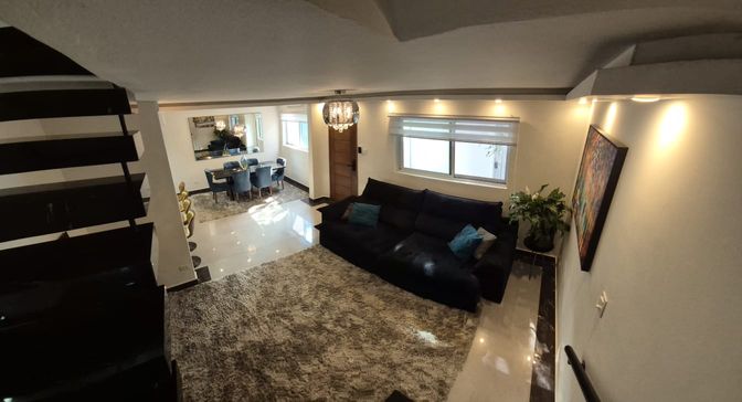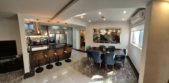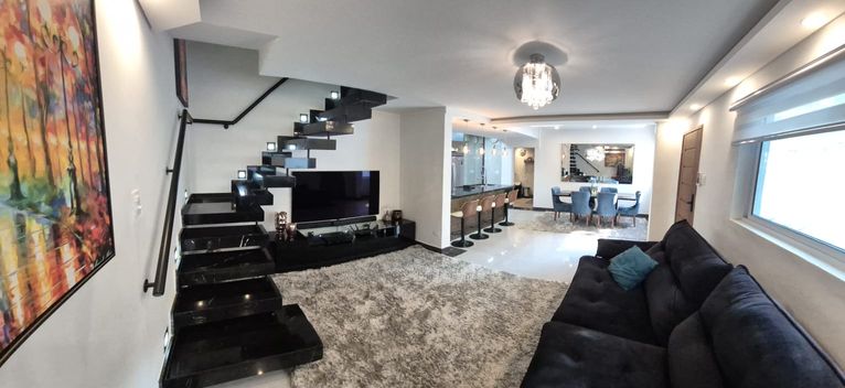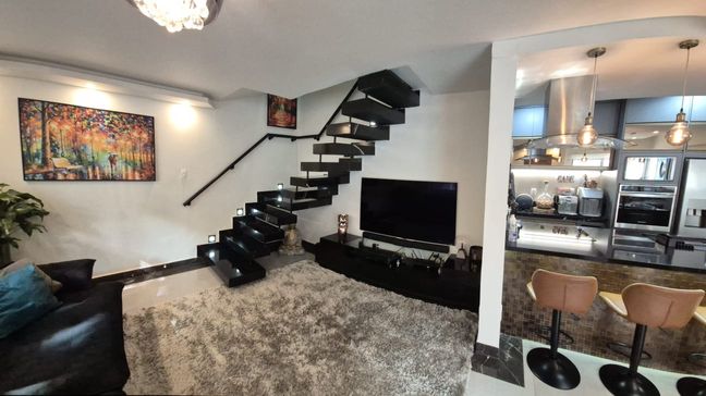 O térreo revela uma sala ampla e fluida para três ambientes, revestida com porcelanato Portobello, iluminação em LED projetada para valorizar o design e parede espelhada que amplia e eleva a atmosfera do espaço. O mobiliário, de estética contemporânea, inclui sofá retrátil e reclinável, mesa para seis lugares e uma imponente TV OLED 65", compondo um cenário ideal para convivência sofisticada.