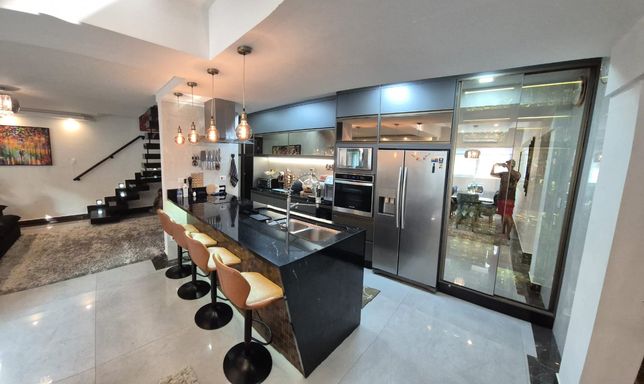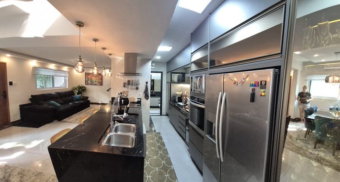 A cozinha alia funcionalidade e requinte: bancada em granito, armários espelhados, torre quente, fogão de indução, lava-louças e geladeira Side by Side inox, formando um conjunto de performance elevada e acabamento de excelência.