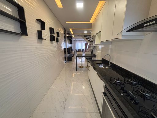 Sobrado de alto padrão à venda na Vila Tupi, em Praia Grande, ideal para quem busca conforto, sofisticação e qualidade de vida a poucos passos do mar. Este sobrado geminado, com aproximadamente 150 m² de área útil, apresenta um projeto moderno e funcional, com sala de estar e jantar integradas, cozinha americana com móveis planejados, ambientes bem iluminados e excelente ventilação natural. O espaço externo é um grande diferencial, contando com espaço gourmet coberto, piscina privativa e uma área perfeita para momentos de lazer e convivência com família e amigos. O imóvel dispõe de 3 dormitórios, todos suítes, proporcionando mais privacidade e conforto, além de varanda com vista lateral para o mar e 2 vagas de garagem.